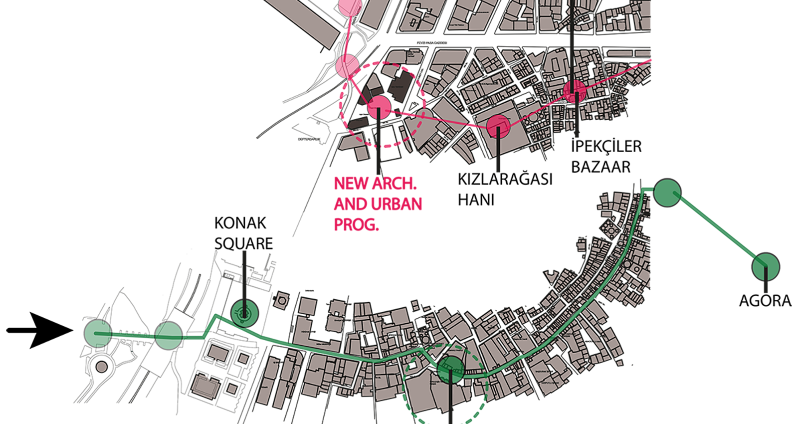 The project in Kemeraltı district and in the overall zone there were two optional site to locate the project. Although these sites are in the same district, contexts of Site I and Site II show structural differences. The proximity of the transportation nodes is stronger at Site I while the density of people is greater in Site II. This unequalibrium problem turns out to be an urban proposal of the project. With this manner, project located in Site I and new alternative urban path was defined to offer vital zone with the helping of the historical