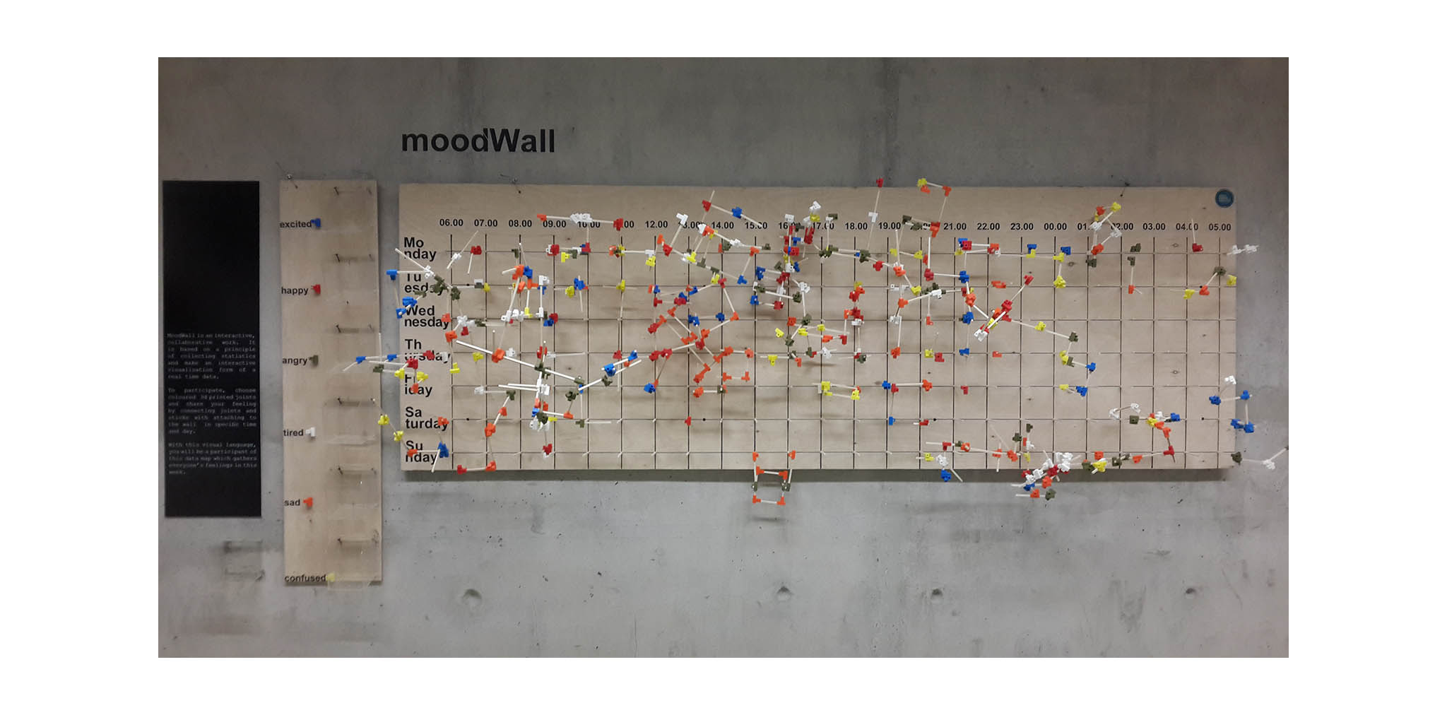 MoodWall installation was supported by Izmir University of Economics between 7-11 March in 2016. The design parameter was the mood of individuals which is symbolized by day-hour table, sticks and 3D printed joints that transform emotional, intangible, uncountable data into visible and create the moodWall itself as a visual language.