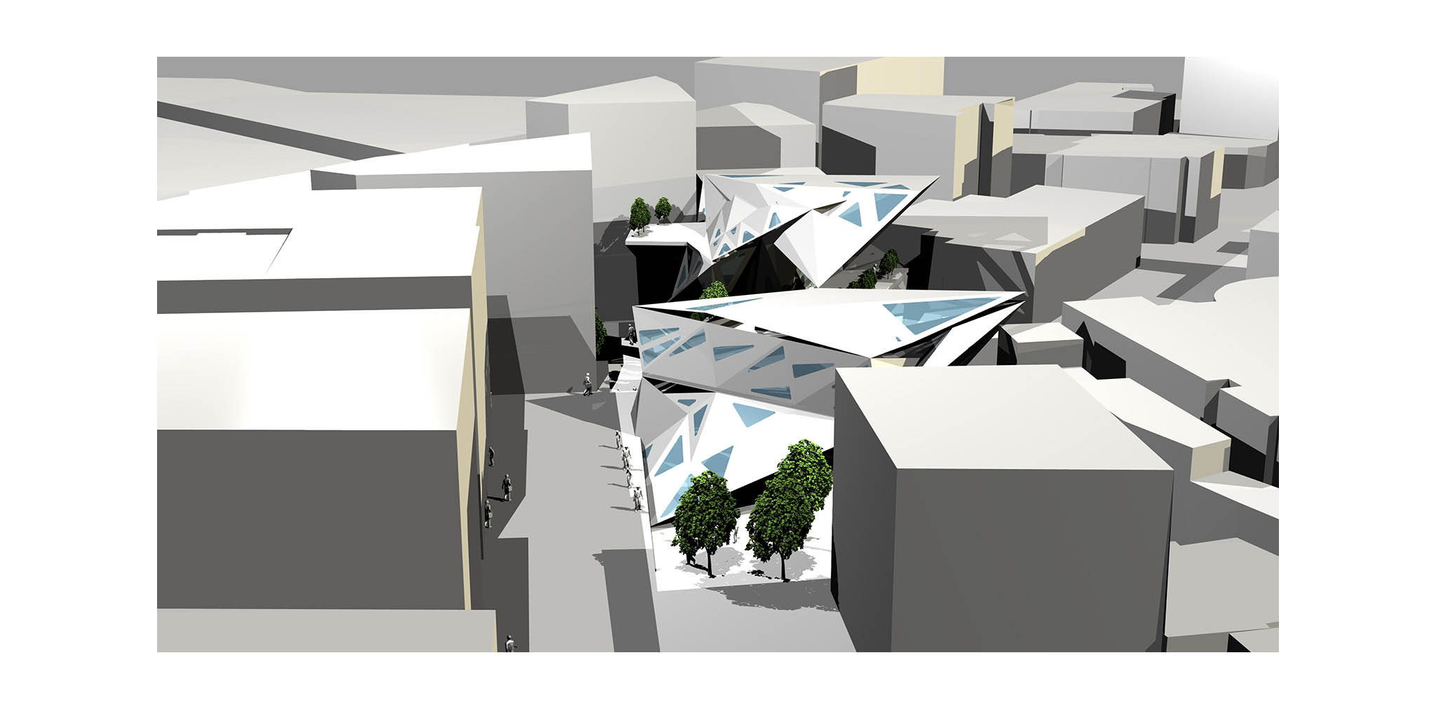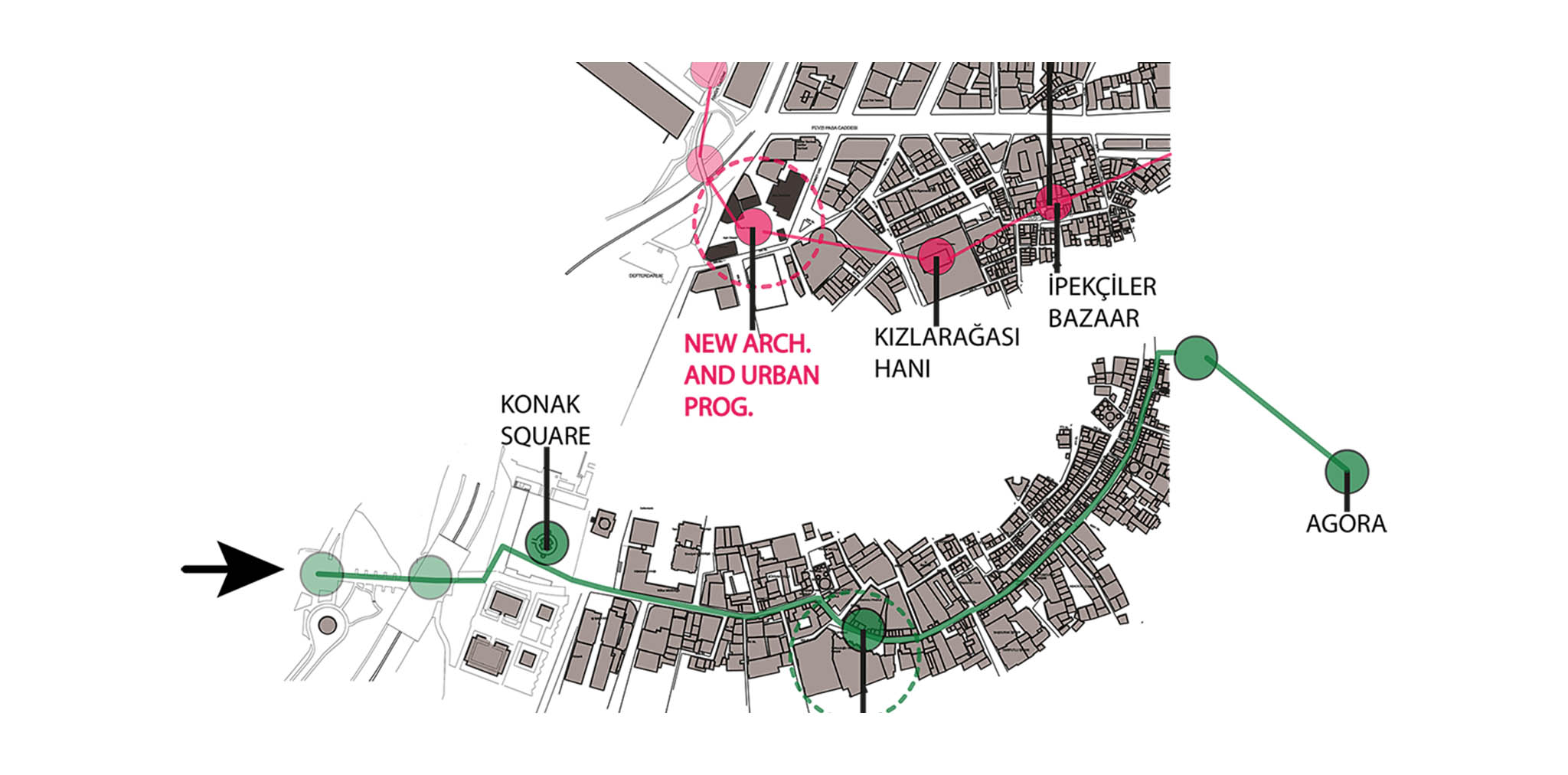bağlamda, Alan I proje alanı olarak belirlenmiş, tarihi yapı ve önemli çekim merkezlerinin yardımı ile alana yeni bir hayati bölge sunmak için kentsel bir aks tasarlanmıştır. Mimari öneride bu parametre projenin bir elemanına çevrilmiştir. Proje alanı içerisinde 2 bölücü olarak kamusal koridor oluşturulmuştur. Bu koridorlar yapıya dokunmadan ana yollarla bağlantıyı sağlamıştır. Bu yaklaşım, proje alanını özel dolaşımı engellemeden kamusal alan olarak kullanma fırsatı oluşturmuştur. Buna ek olarak, yapı içerisindeki programlar ve bunların yerleşimi, çevresel analizlerle toplanan veriye göre belirlenmiştir.